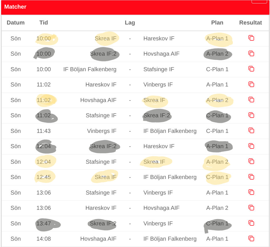 Hej! Se nedan spelschema för sammandraget i Vessigebro. 10:00 Vessige Grön - Skrea 11:20 Böljan Vit- Skrea 12:00 Stafsinge Röd - Skrea