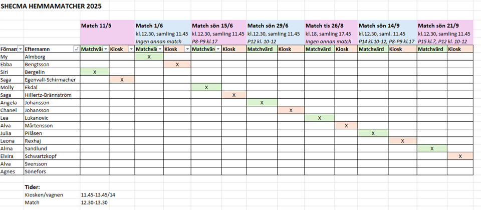 Hej! Här kommer schema för vilken familj som är matchvärd eller bemannar kiosken vid de tillfällen som tjejerna har hemmamatcher. Schemat är bara utlagt efter bokstavsordning och inte samordnat med vilken match tjejerna spelar (om man står över el inte), då detta inte är klart för alla matcher än. Om ni inte kan det tilldelade tillfället är det upp till er byta med annan förälder! Ni kan själva välja om ni vill ha kiosken öppen eller använda vagnen (som packas med fika och dras ut till planen). Men vid matcher runt lunch (som vi oftast har) kan det ju vara lämpligt att koka korv och därmed vara i kiosken :) Vi får testa efterhand vad som funkar bäst! Vissa datum är det andra lag som spelar i anslutning (står under resp. datum) och vi återkommer med om vi kan ta över kiosken efter dem och isf vilken tid. Annars lämpligt att komma och starta upp när tjejerna har samling. Ledarna kommer låsa upp/låsa kiosken och stöttar med vad som ska göras som matchvärd. Instruktion om hur man sköter kiosken finns i kiosken. Kom ihåg att skriva upp försäljningen i blocket/anvisat papper, så går 30% av försäljningen till laget. Som det ser ut nu har vi inga A-lagsmatcher där vi ska bemanna kiosken innan sommaren. Återkommer med ev. tider efter semestern när vi vet. Sen vill jag även passa på att säga att vi fått en till lagförälder - Lina Sönefors (Agnes mamma). Välkommen! :) Har ni frågor eller funderingar, hör av er till någon av oss! Mvh Vera